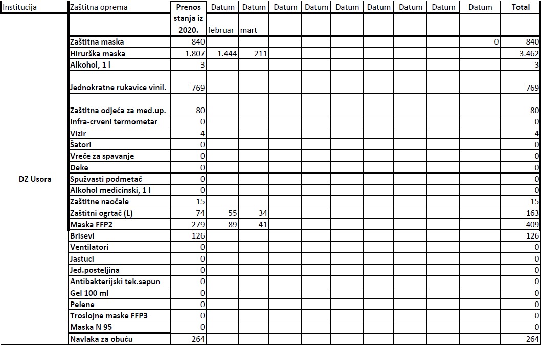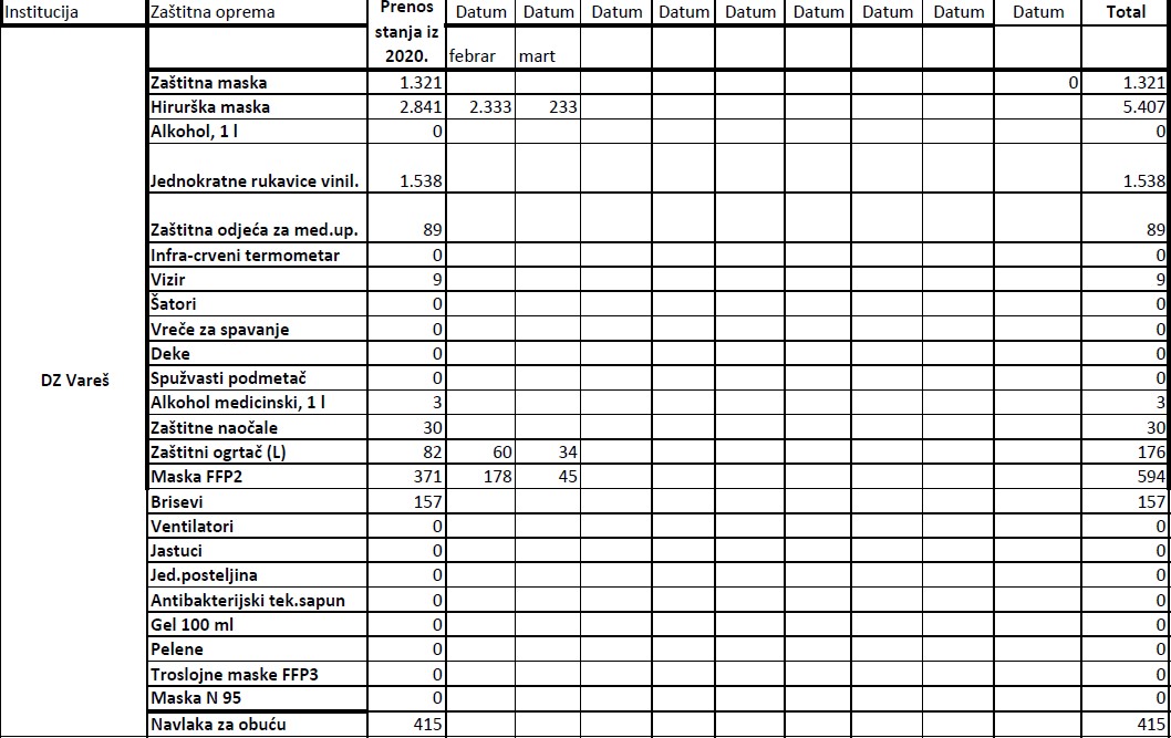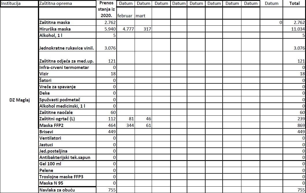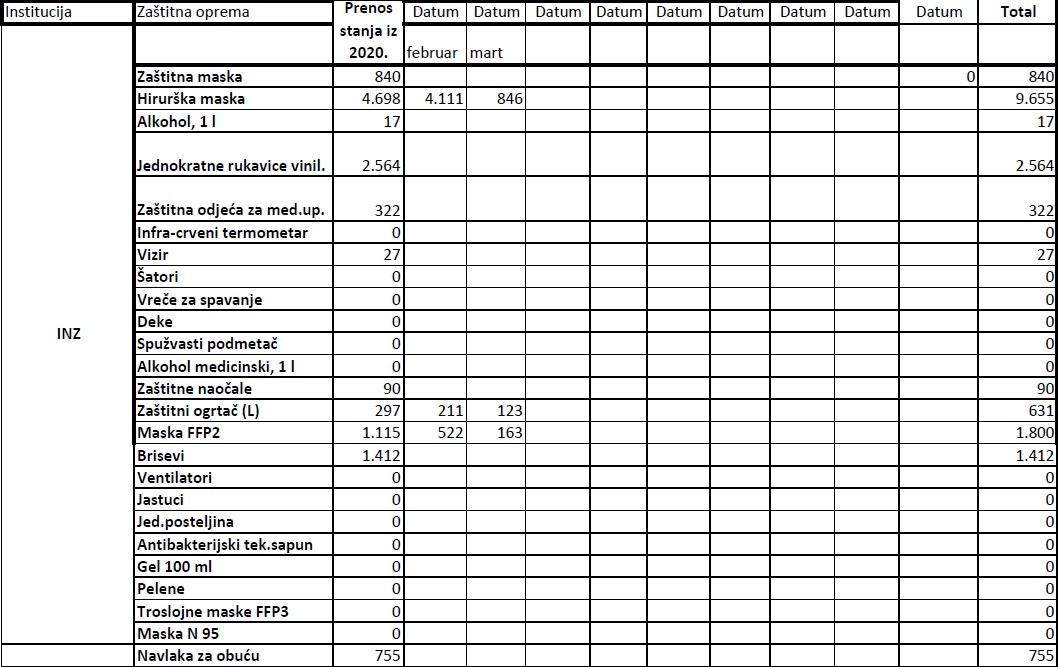 Evidencija izdate zaštitne opreme institucijama u 2021. godini do 19.03.2021.godine