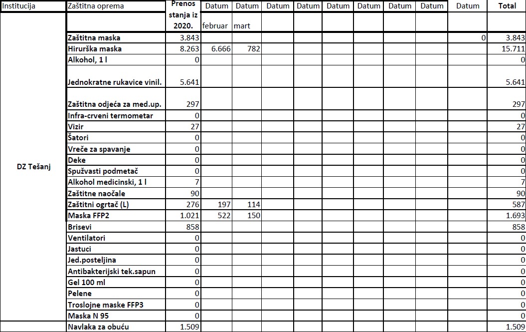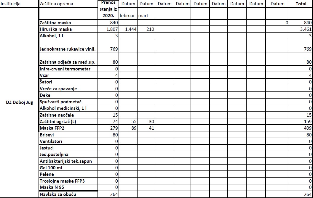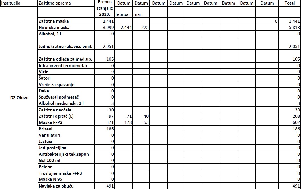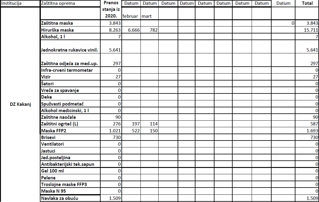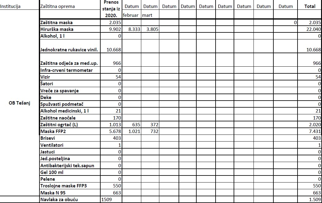 Evidencija izdate zaštitne opreme institucijama u 2021. godini do 19.03.2021.godine