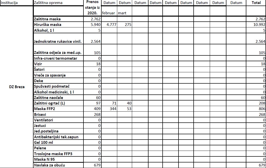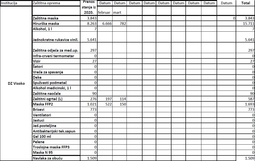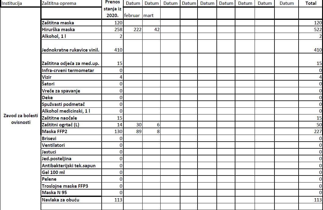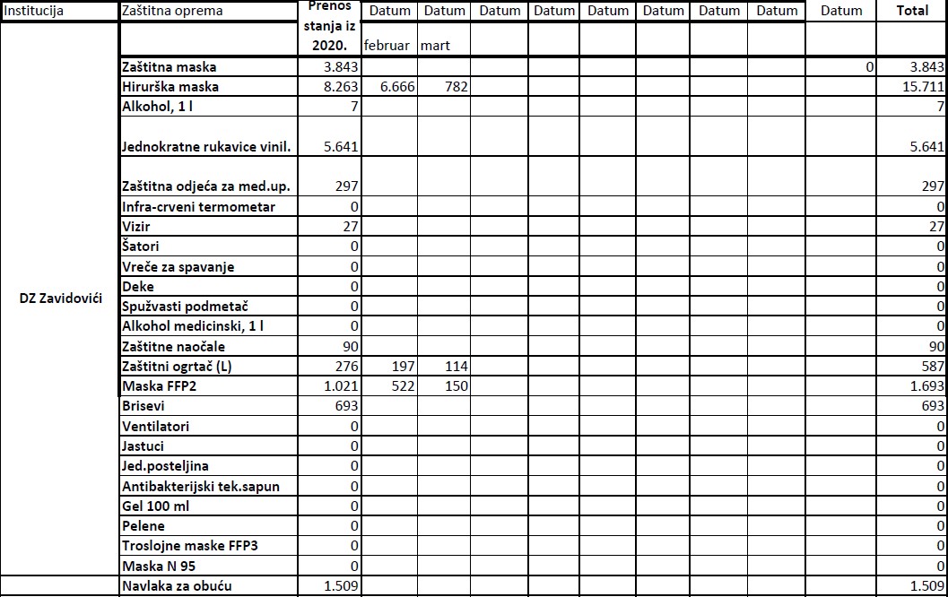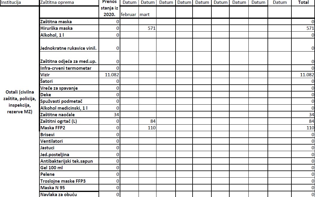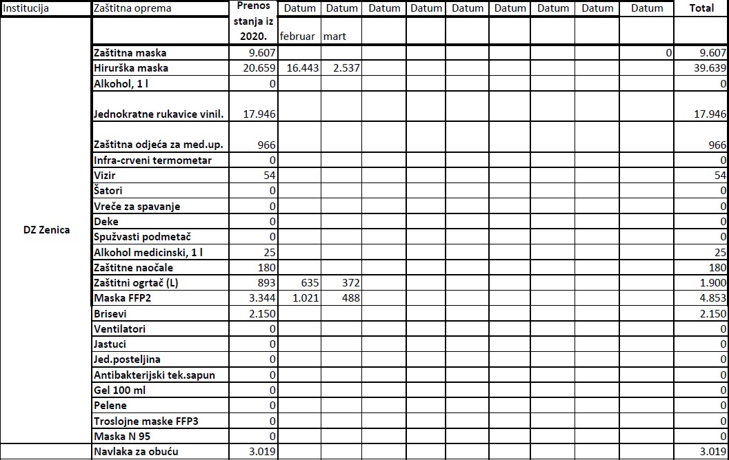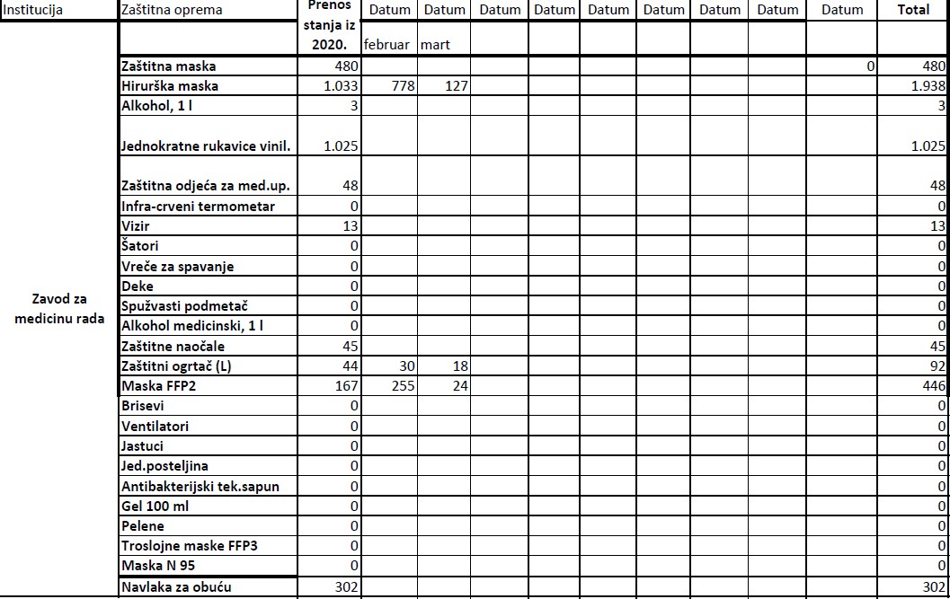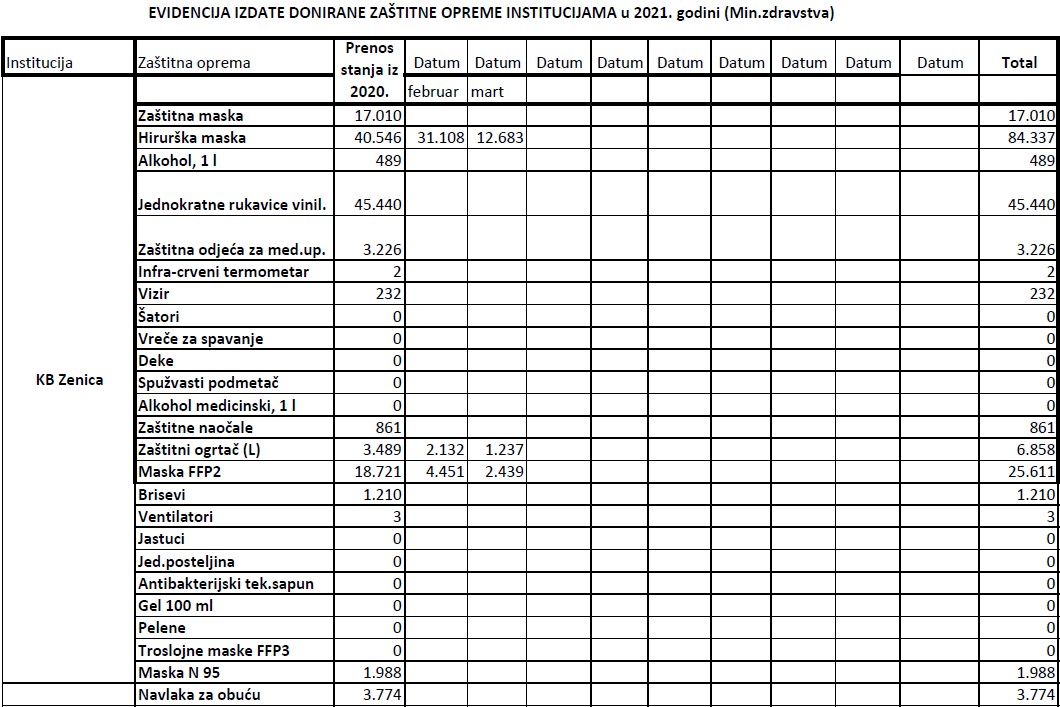 Evidencija izdate zaštitne opreme institucijama u 2021. godini do 19.03.2021.godine Ministarstvo zdravstva