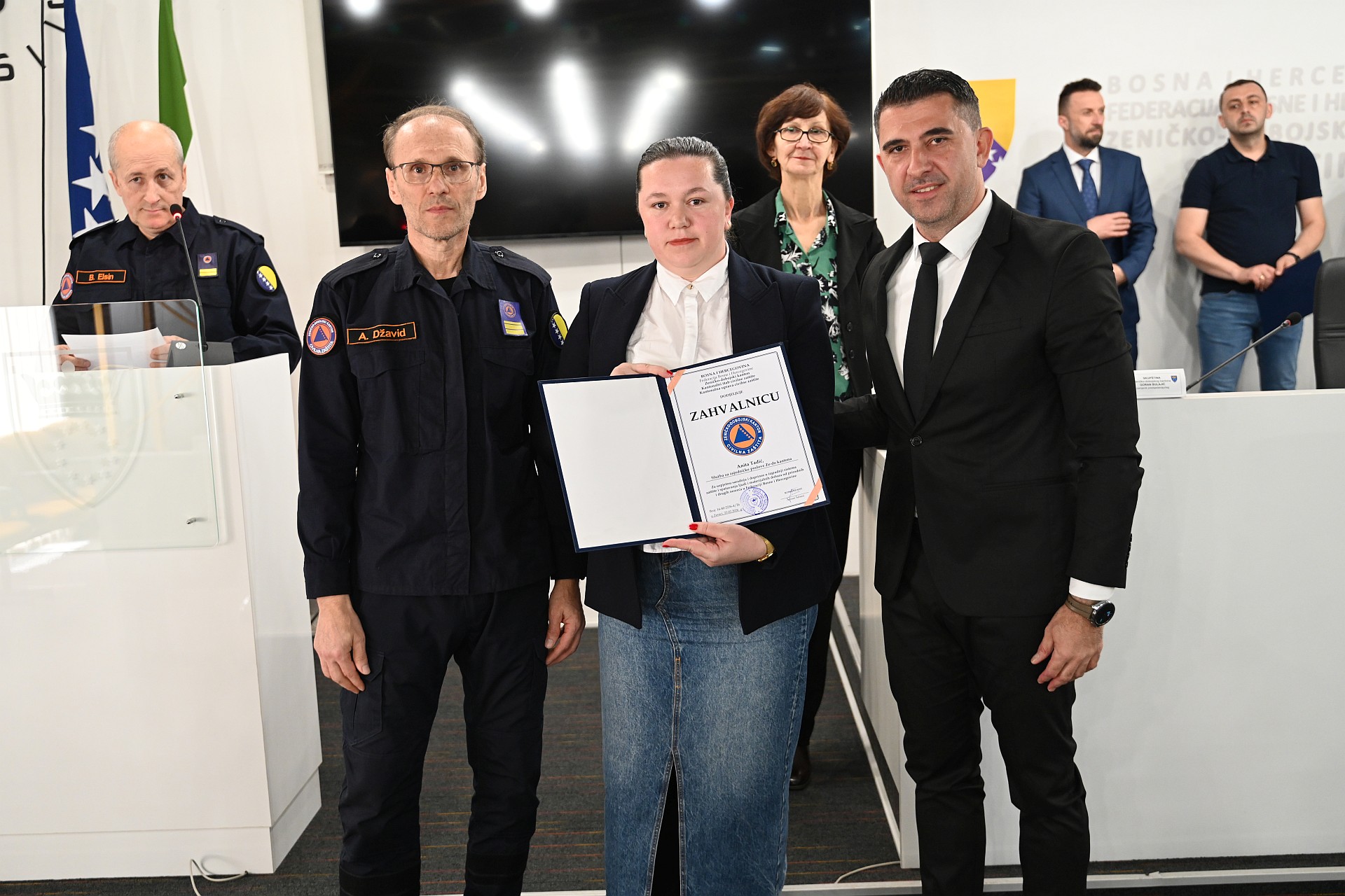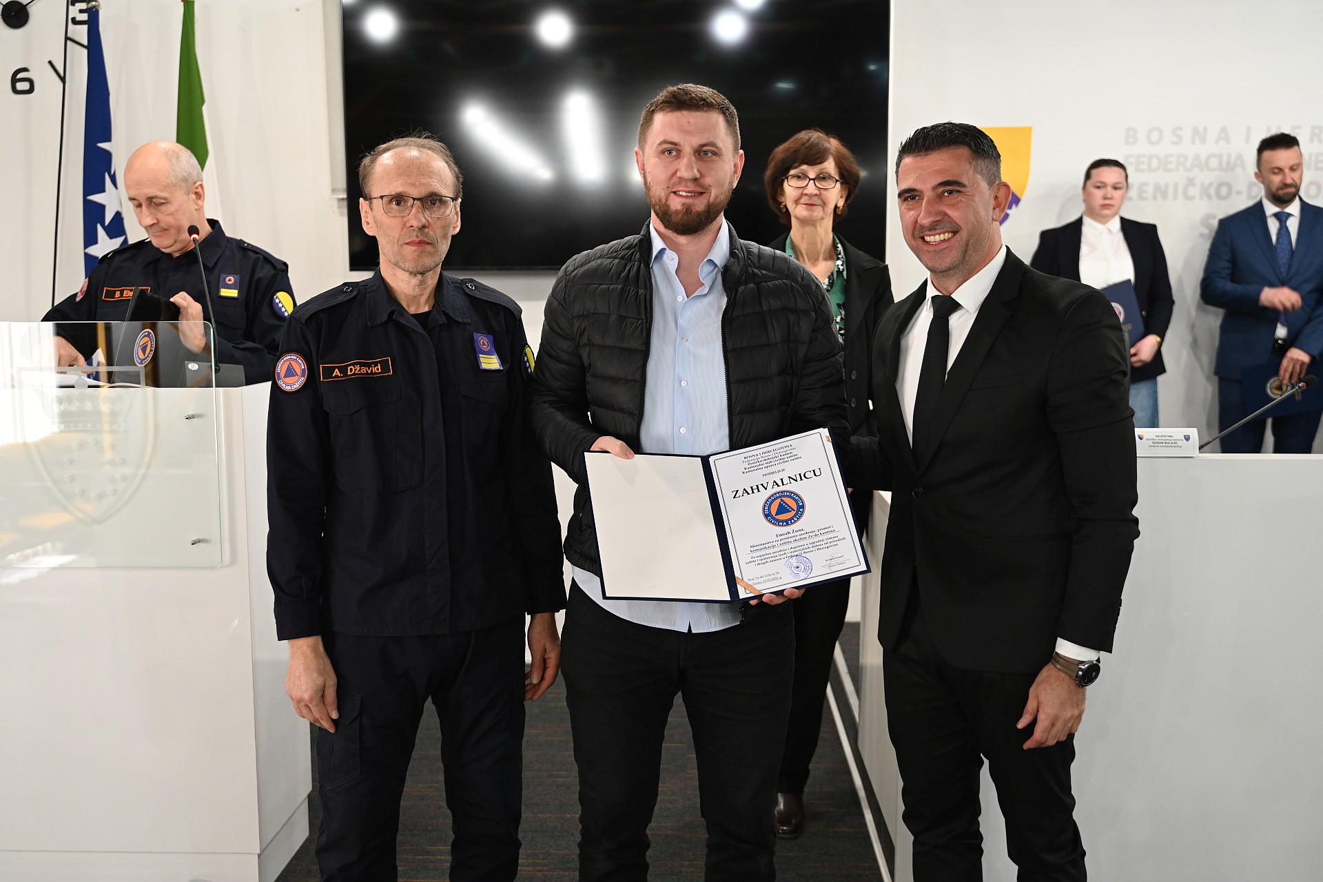 Priznanje "Pisana zahvalnica" uručena je Aniti Tadić iz Službe za zajedničke poslove Zeničko-dobojskog kantona i Emrahu Žuni iz Ministarstva za prostorno uređenje, promet i komunikacije i zaštitu okoline ZDK-a, koji su kao članovi komisije za javnu nabavku vodili postupak nabavke višenamjenskog helikoptera za potrebe civilne zaštite i policije u ovom kantonu. Treći član komisije Arslan Žuna, službenik Kantonalne uprave civilne zaštite ZDK-a, predložen je za priznanje koje dodjeljuje Federalna uprava civilne zaštite.
